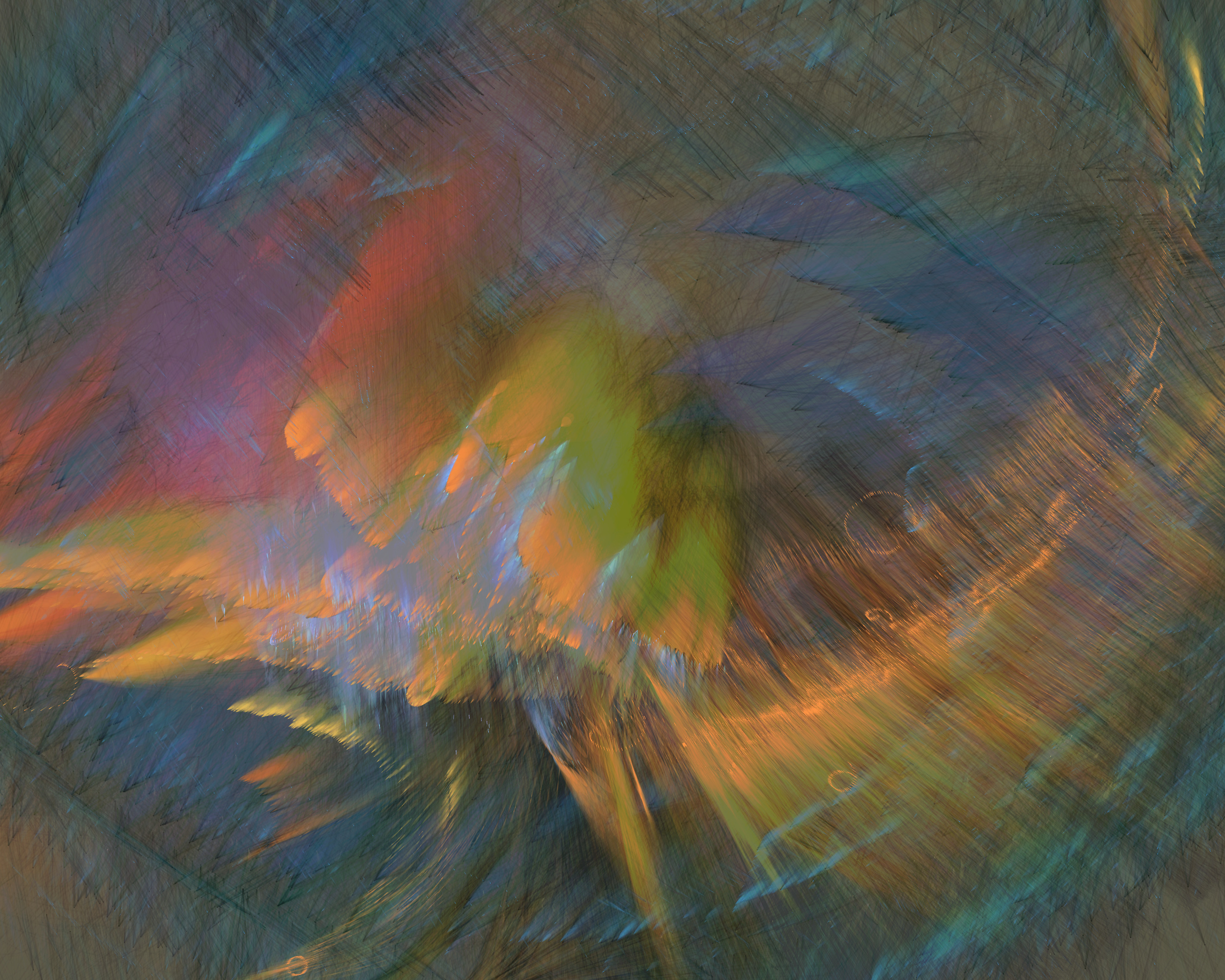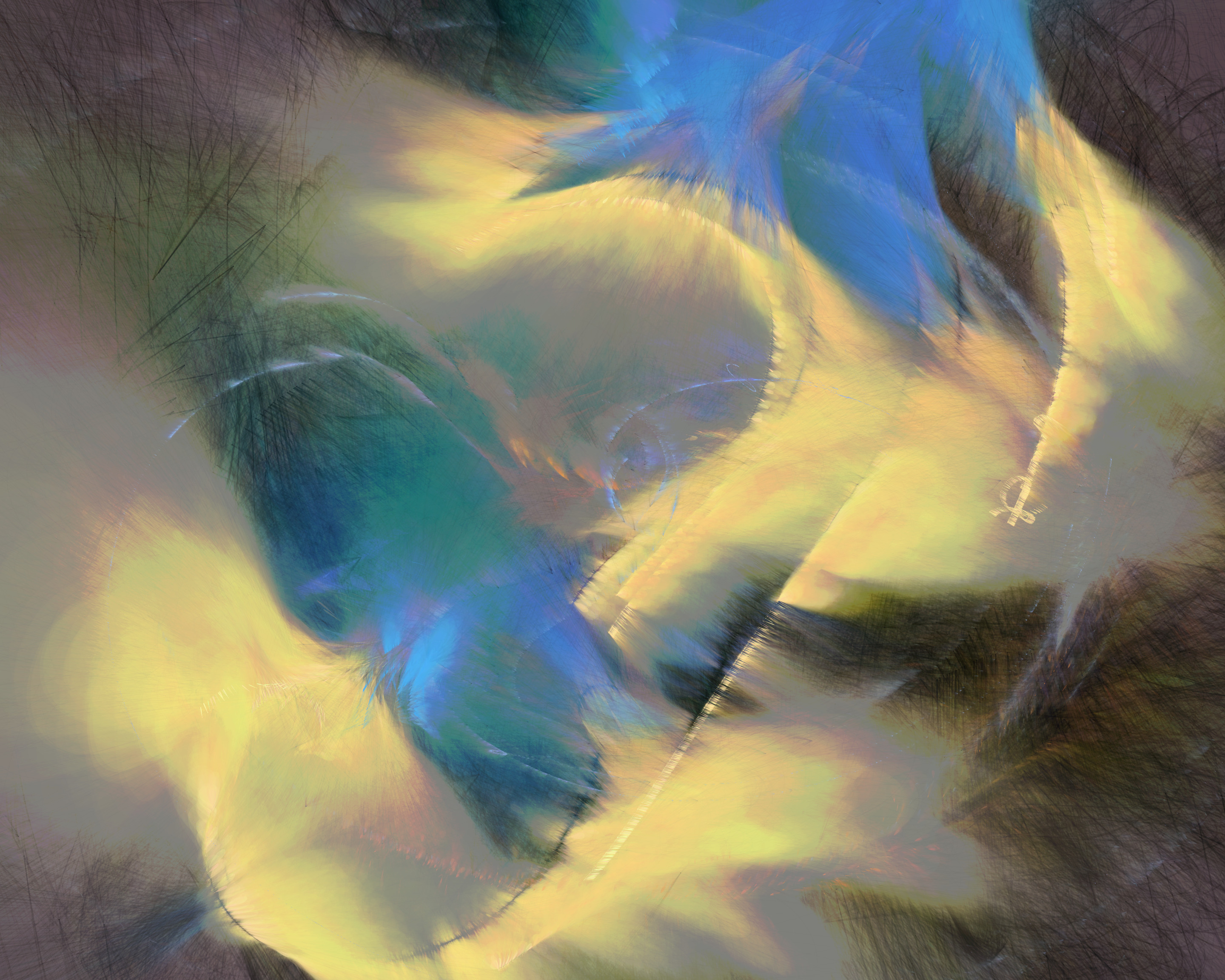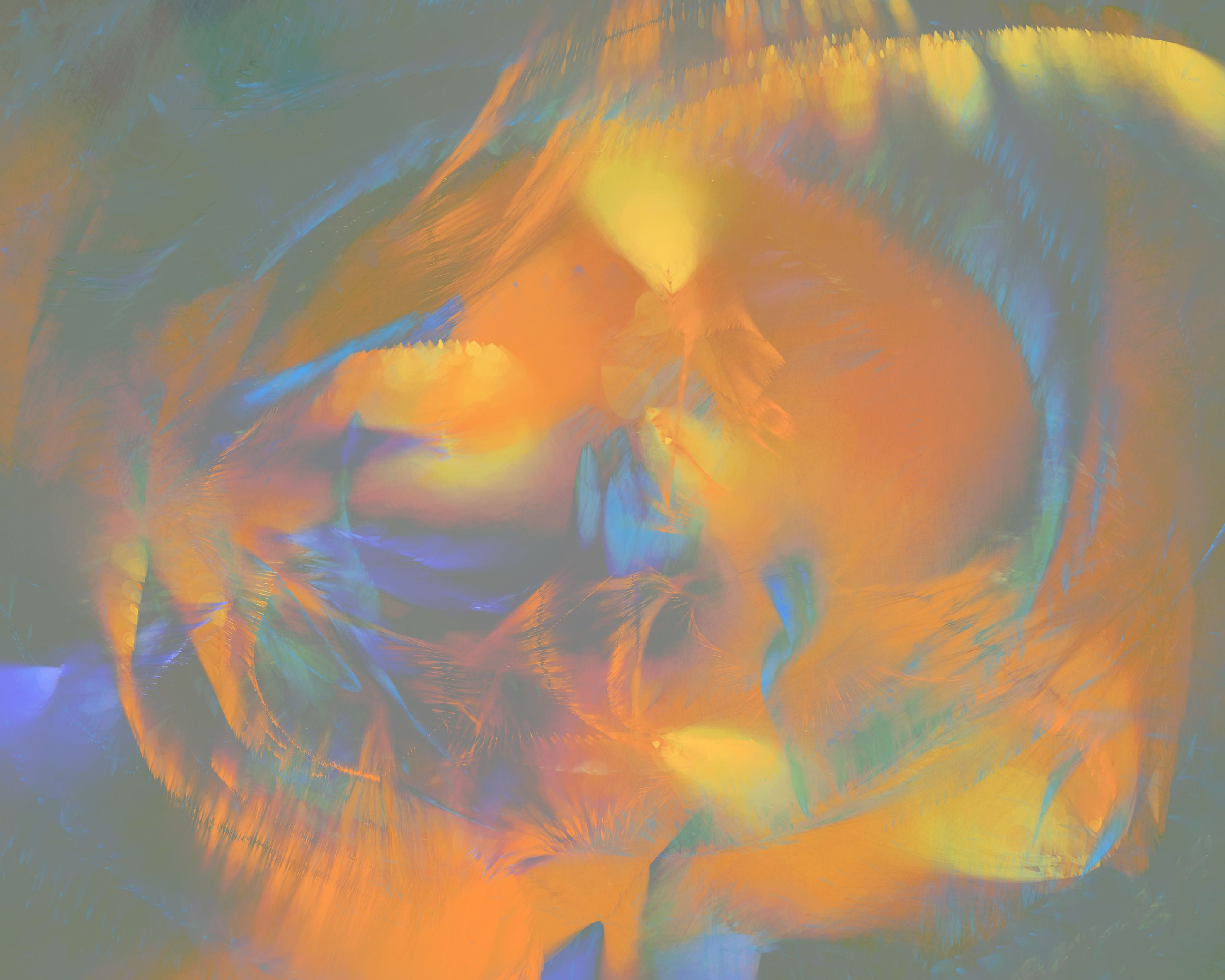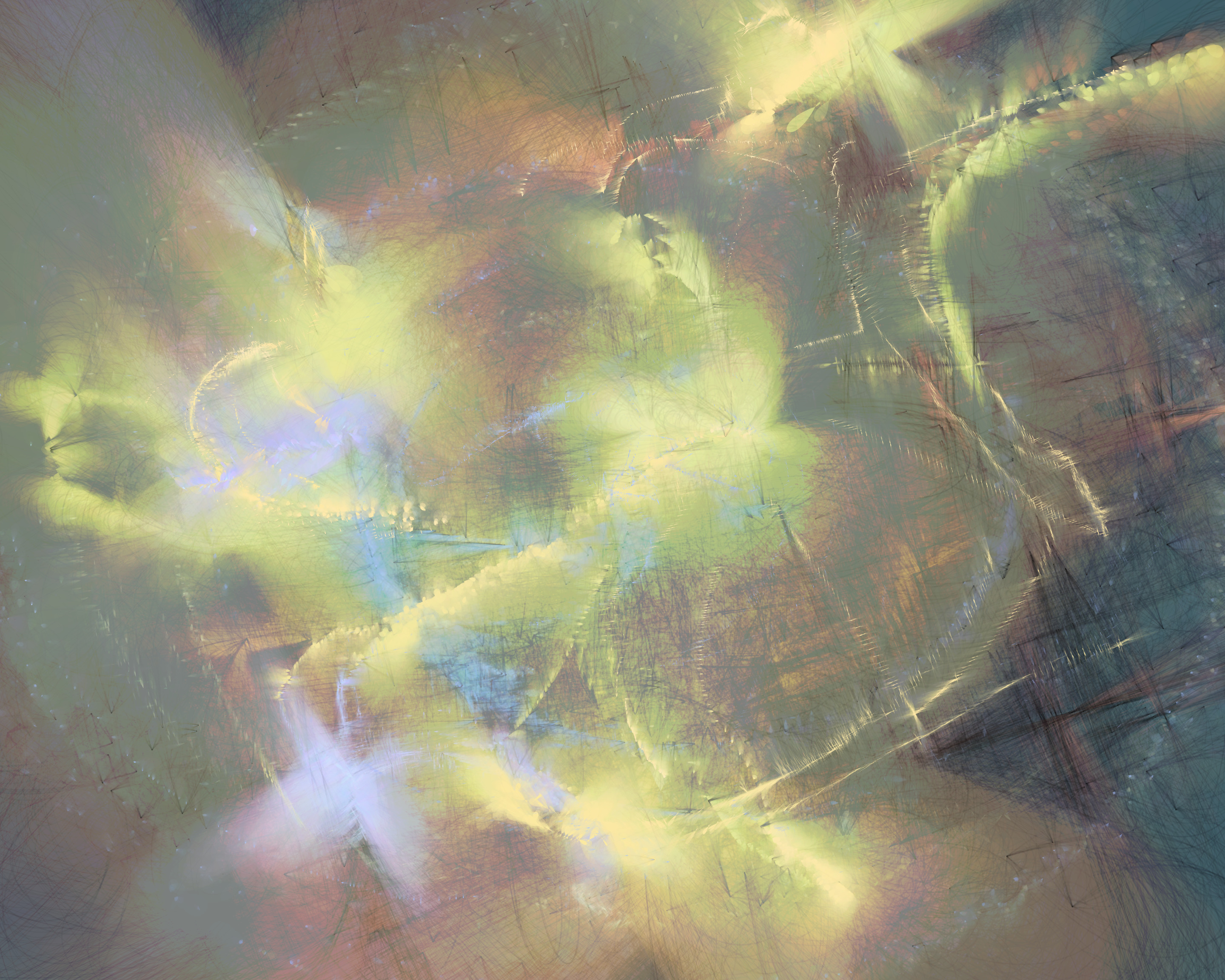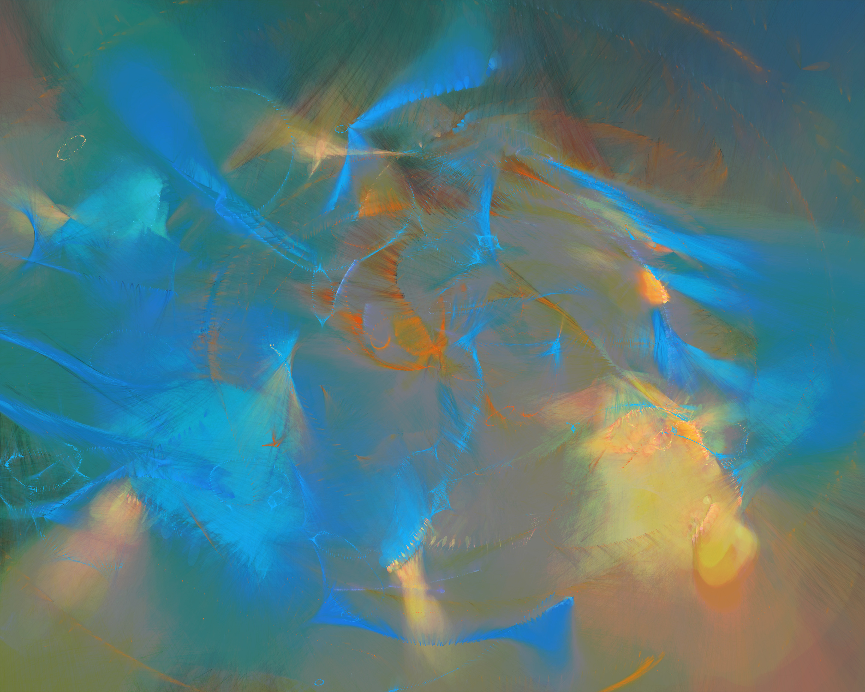 The 19 palettes are inspired by the natural world, but their roles are sometimes twisted: cerulean blue strokes appear over an ochre canvas, and green flashes of light hop across a gray expanse. I invite the viewer to spend time with each piece, finding their own order from chaos. Signed fine-art archival inkjet prints will be available for owners at a modest cost.